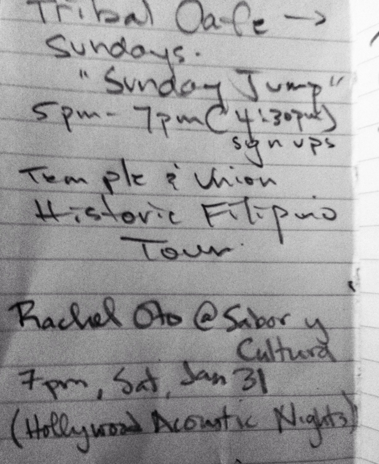 One of the boxes we keep out at LAWS is called the Rolodex & Calendar. It’s where people can leave/take cards, flyers, stickers, notes, doodles, etc.. There’s also a little black book inside where people can add upcoming events (in no particular order) so interested parties can browse.