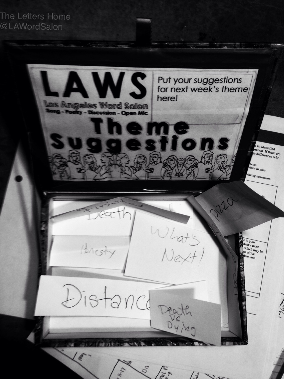 Here are the theme suggestions gathered at LAWS #16 The Letters Home and LAWS #15 Monsters. We closed the theme suggestion box during Monsters, because we knew The Letters Home were going to join us for their music video shoot on that date. We compiled two weeks of the submissions, and they’re sparse, but have a general focus. Which one would you have gone with? What would have you added? So curious! Scroll to see what we chose!