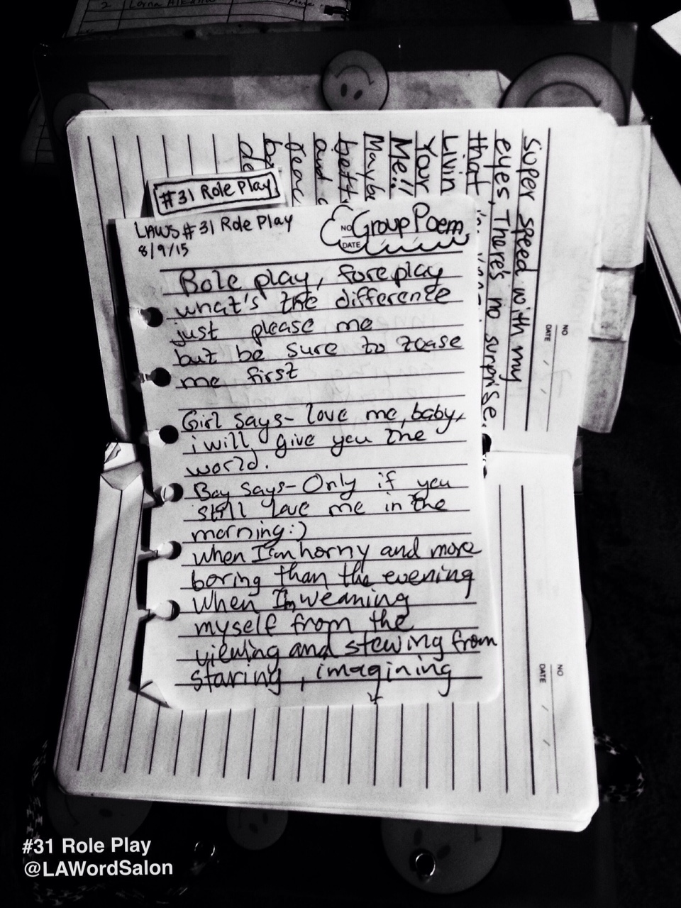 Without further ado we present to you the LAWS Group Poem from two weeks ago, LAWS #31 Role Play.
