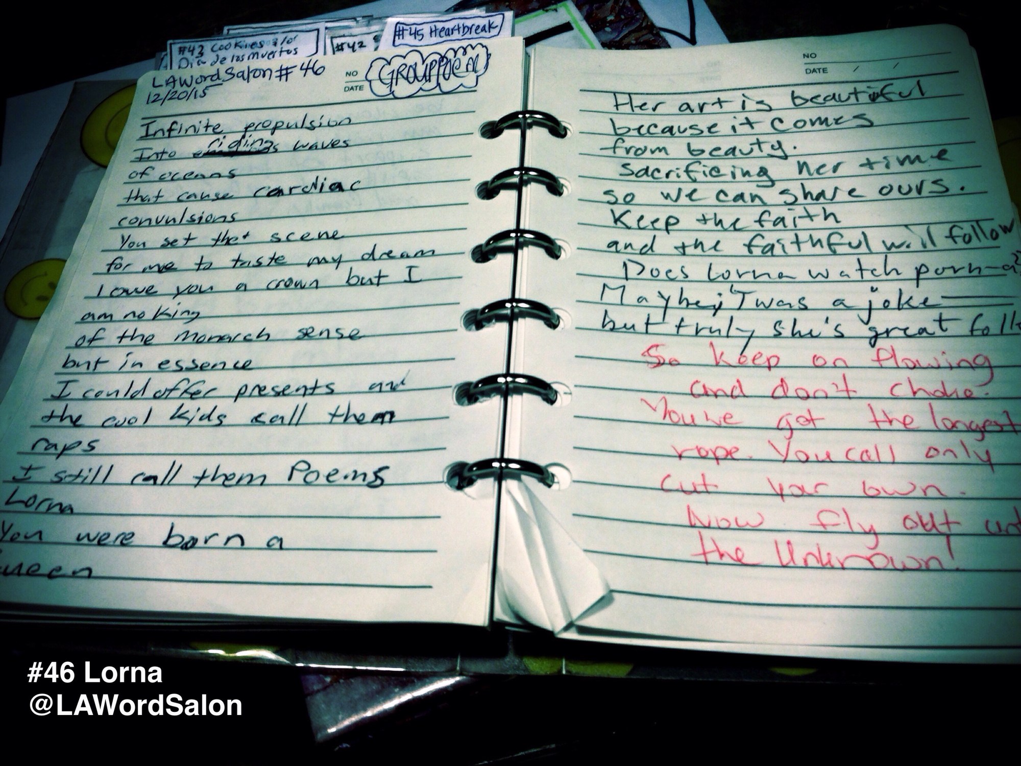 Every LAWS we put some words together in the form of a Group Poem. Here’s our words from last Sunday at LAWS #46 Lorna!
